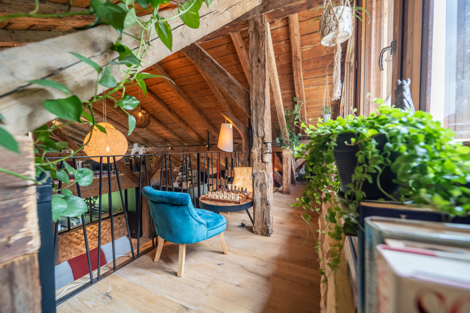Sous le toit, une salle de jeux avec billard et jeu d'arcade ainsi qu'un coin lecture et jeux d'échec surplombent la pièce de vie.